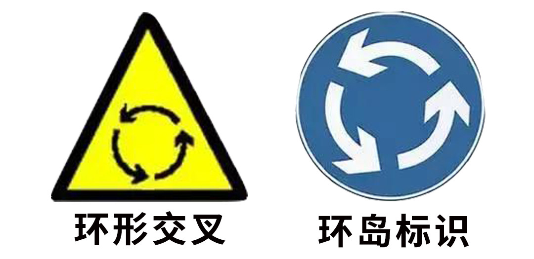 这两图标很有“异卵双胞胎”的感觉,符合虽然相同,但是底色和形状有所不同,对于这两个还是按照颜色区分就好,黄色代表警告,注意前面是环形交叉路口;而蓝色底在交规中通常表示告知提醒的意思,所以蓝底带有环形的标识,所表示的意思就是前面即将进入环岛啦。
