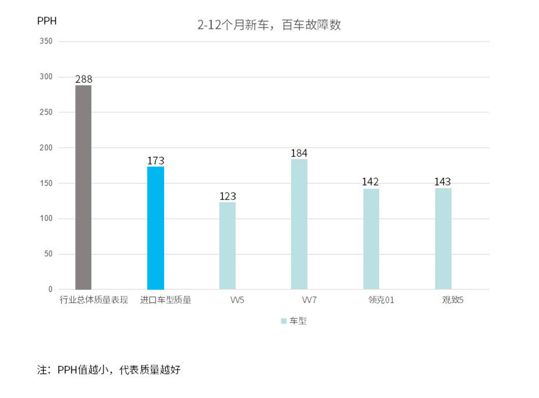 看完上两个图再看这个,你应该会感到不少的惊讶,国产高端SUV车型的PPH值甚至低于了进口车型的平均值,相比国产普通车型,其质量水平更是翻翻地提高。这说明两个问题,一、中国车企只要愿意做,绝对能生产出国际一流的产品;二、同一家车企的中端和高端两个品牌,所生产出来的产品质量差异竟会如此之大,这背后真的只是产品定位问题而已吗?值得深思。