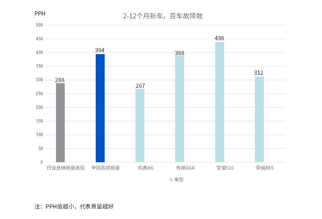 本次用于评价质量水平的指标为PPH(百车故障数),计算公式为PPH=对应车系故障总数÷所有参与评价的人数总和×100,PPH是汽车行业内最具说服力的质量指标,数值越小说明质量越好。从柱状图可以看出不少东西,一、中国品牌车型平均质量水平低于全行业总体水平,而且差距不是一点两点;二、销量好的车型质量水平相对较高,这个群众购车的普遍哲理得到了验证,从H6、GS4、RX5的良好表现可见一斑;三、质量水平并不是中国群众购车的唯一指标,只要其他方面做得足够好,照样可以上神坛,如宝骏510,质量水平一般,但依靠群众普遍赞赏的外形、空间和性价比,销量屡屡超神。
