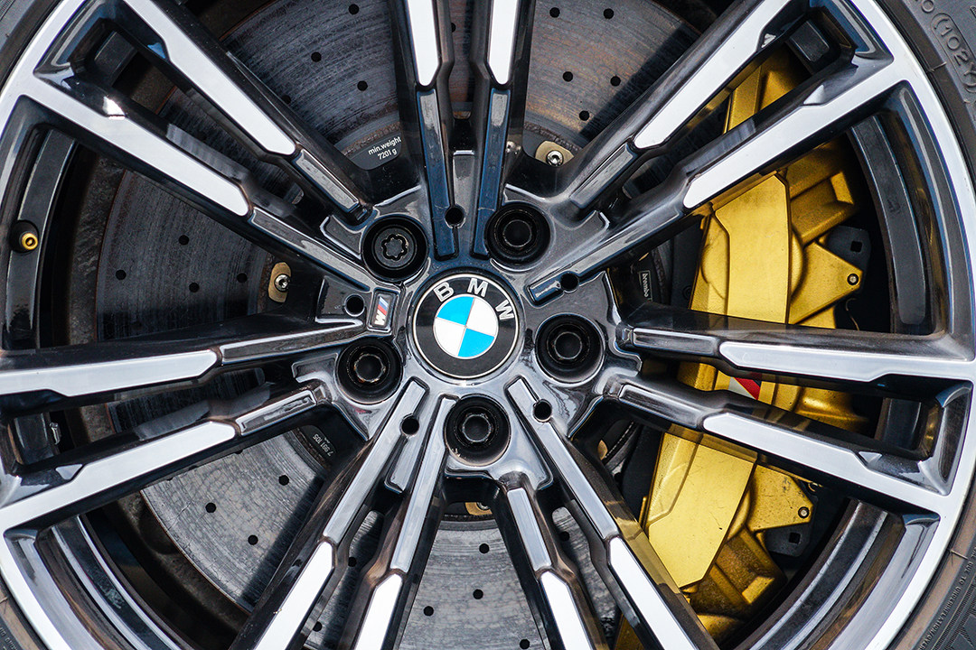 前轮配备了6活塞刹车卡钳,值得注意的是,若刹车卡钳为金黄色,则证明该辆M5还选配了碳陶刹车盘。