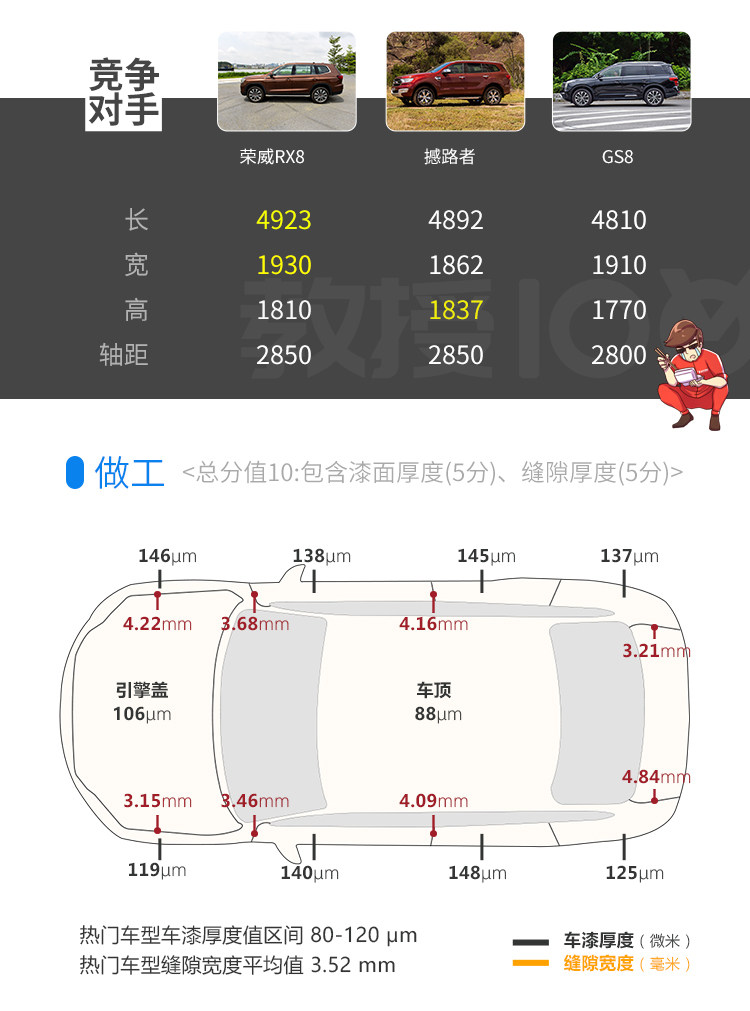 RX8的车身尺寸方面领先同级别其他对手,无论是长宽高三围尺寸都比最直接的竞争对手GS8大,得益于其尺寸相对大,所以车内空间应该能得到保障。其次RX8自身的做工也相当出色,无论是漆面还是缝隙都很均匀,不会出现较大的差异,可以说RX8是国内造车最高水平的一批。