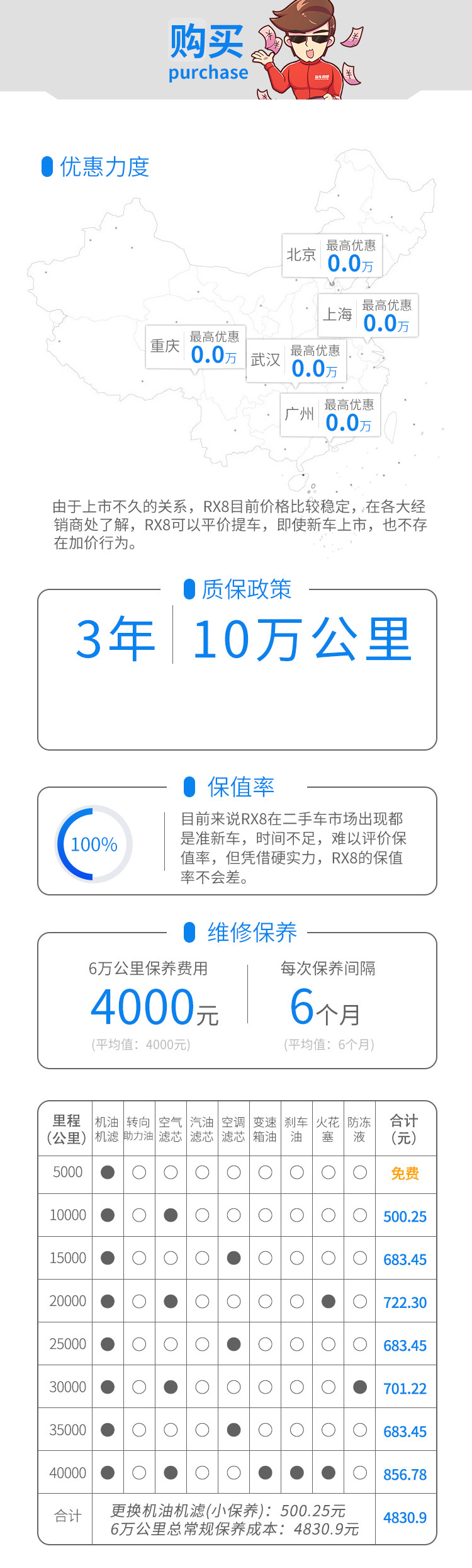 RX8全系有8款车型之多,其中两驱和四驱分别都有4个车型,如果您觉得RX8更多的需要用来翻山越岭,带你去领略更多风景的话, 选择四驱车型。如今RX8在上市之初没有很大的优惠,但由于其上市定价就比较合理,并且由始至终都没有加价的行为,是一台真正意义上的国民旗舰。再加上其价格相宜的保养保修政策,RX8的维修保养处于同级别主流水平,更换一次机油只需500出头,要知道即便是B级轿车,小保养也在700左右。