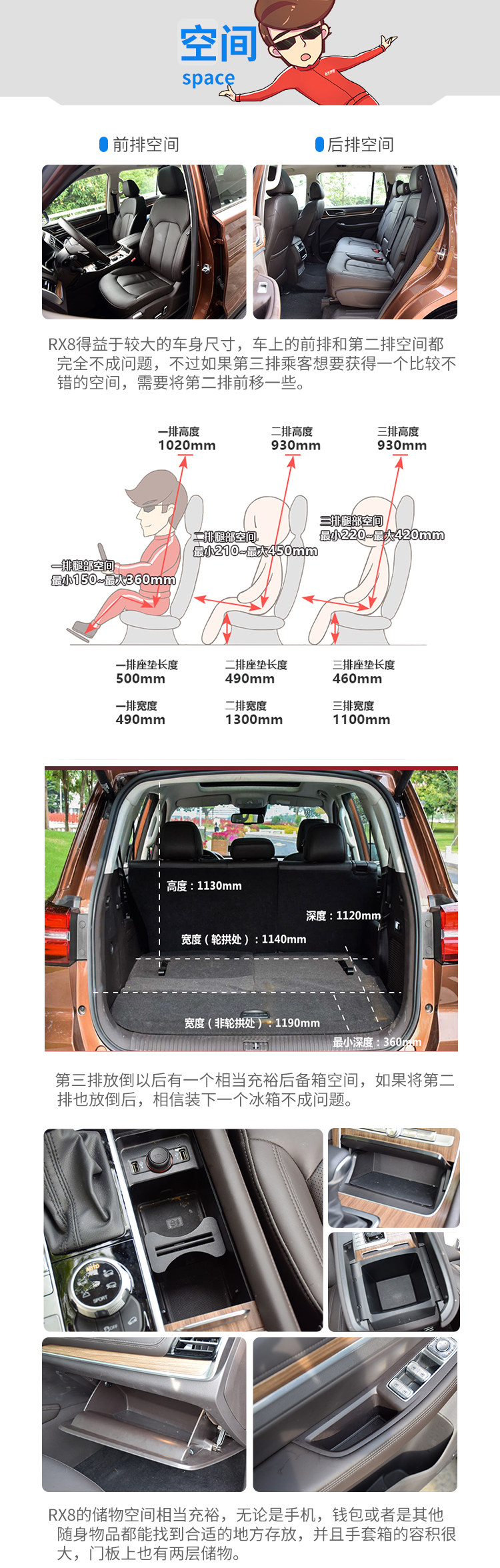 RX8的储物空间还算足够,门板上上下两层储物格,中央地台显示屏下方有一个空间不错的储物格,还有两个杯架,中央扶手箱由于空气净化器的原因,侵占了一些空间,第二排除了门板上跟前排一样以外,还有中央扶手有杯架和储物盒,第三排也有两个杯架,对于乘客的照顾也是相当足够。