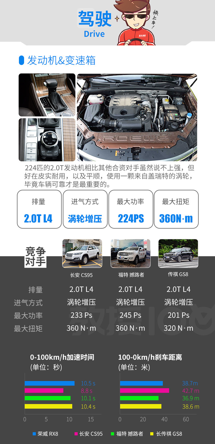 荣威RX8的变速箱来自爱信产品,我们都知道,丰田和雷克萨斯全系都使用来自爱信的产品,可靠性绝对不成问题,6AT在换挡的平顺性是同级别最顶尖的水平,而换挡速度却不尽人意,不算干脆。并且RX8使用的是米其林primacy SUV轮胎,尺寸为255/50 R19,再加上其非承载式车身的重量,0-100km/h加速时间为10.5秒,对于这样一台庞大身躯的SUV来说,这样的加速成绩相当出色!同级别的H9需要12.38秒,上汽大通D90需要11.2秒!相比起来RX810.5秒的加速时间领先对手!2秒的差距对于传动系统的考验相当大,也在侧面证明了RX8的高水准的机械性能。100—0km/h的刹车距离为38.7米,这是惊艳到教授的一点,如果40米为及格的话,RX8拖着这样庞大的身躯在38.7米的确是很强!很多比它轻多了的轿车都做不到这样的水平。