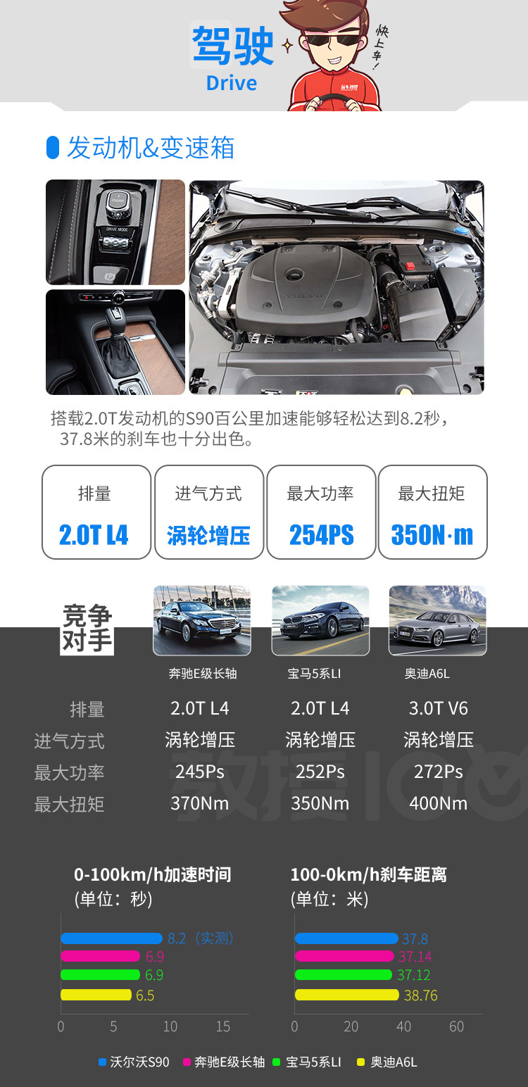 实测沃尔沃S90的加速时间为8.2秒,起步瞬间车身姿态很平稳优雅,这也符合一台中大型车应有的表现,虽然加速时间不算快,但是加速感还是很强烈的,车身也非常平稳,换挡过程足够平顺,即便在全油门加速状态下,S90都是气定神闲的感觉。