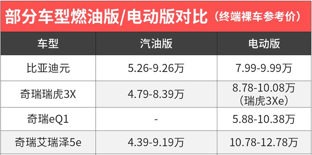 不过如今新能源车型的价格正在慢慢地向汽油车的价格靠近。比如说8万可以买到比亚迪元纯电,同车型的汽油版本自动挡也需要7万多。类似的车型还有奇瑞瑞虎3Xe、奇瑞eQ1等。