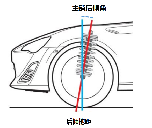 主销后倾指的是转向主销相对与地面垂直线往后倾斜角度,也就是从车身侧面看悬架往后的倾斜角度。主销后期是为了让车轮产生回正力矩,在高速行驶时使方向盘回正保持直线行驶,后倾角与车轮接地点的距离称作后倾拖距,拖距越长回正力矩越大,较大的后倾角可以让轮胎具有更好的稳定性。