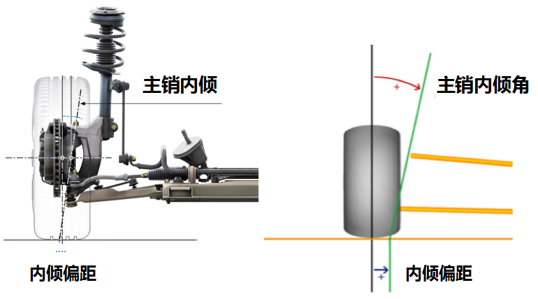 主销内倾就是从正面看转向主销往内倾斜的角度,内倾也有控制方向盘回正力矩的功能,只是在速度较低时比较明显,内倾角与轮胎中心点的距离称作内倾偏距,偏距大回正力矩越大,大家常说的方向盘打手就是因为内倾角过大。