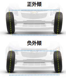 从车轮正面看,轮胎下侧距离高于上侧叫负外倾,反之就是正外倾。负外倾角可以提高车轮弯道抓地力,由于负外倾车轮并未与地面垂直,所以直线时车轮接地面积小,因此会影响车轮加速和刹车性能。
