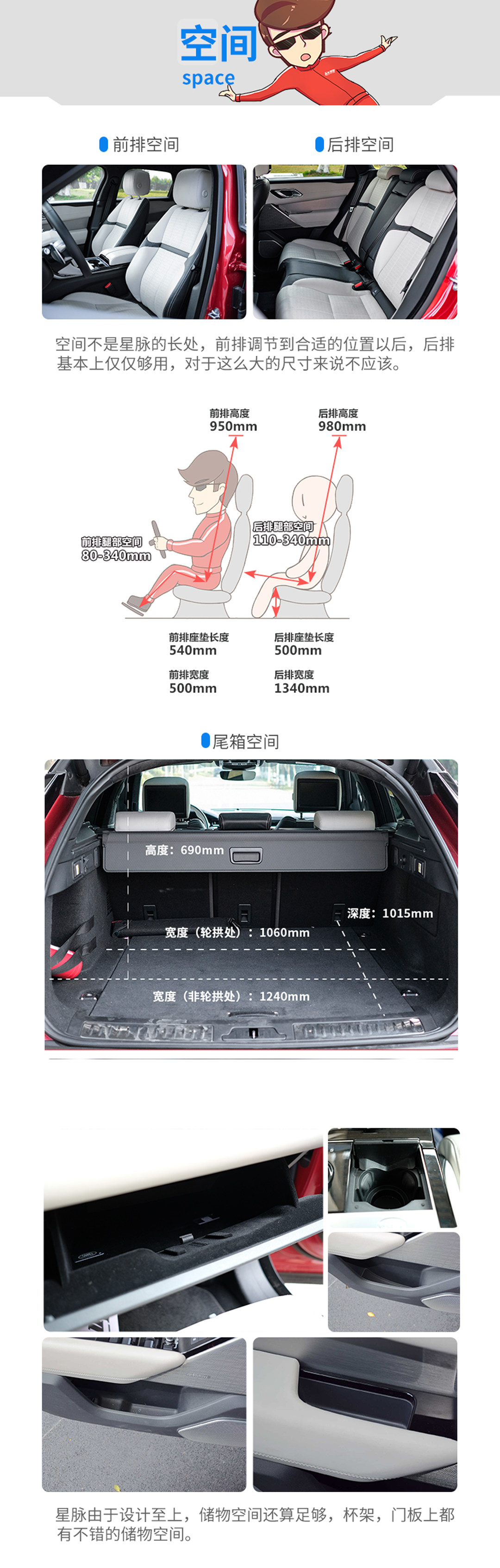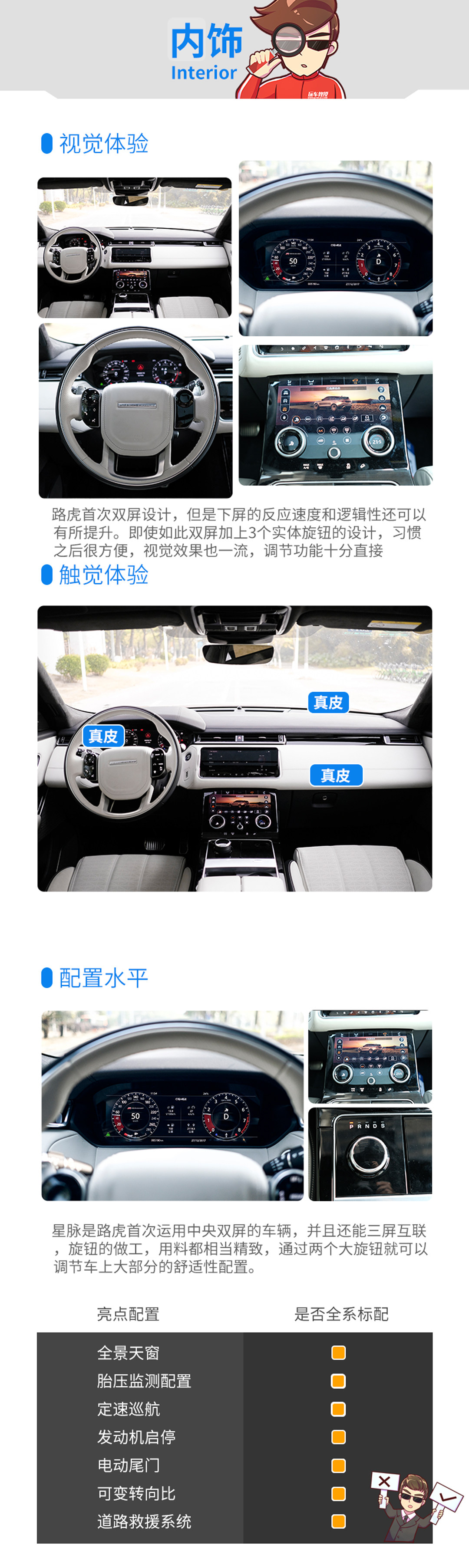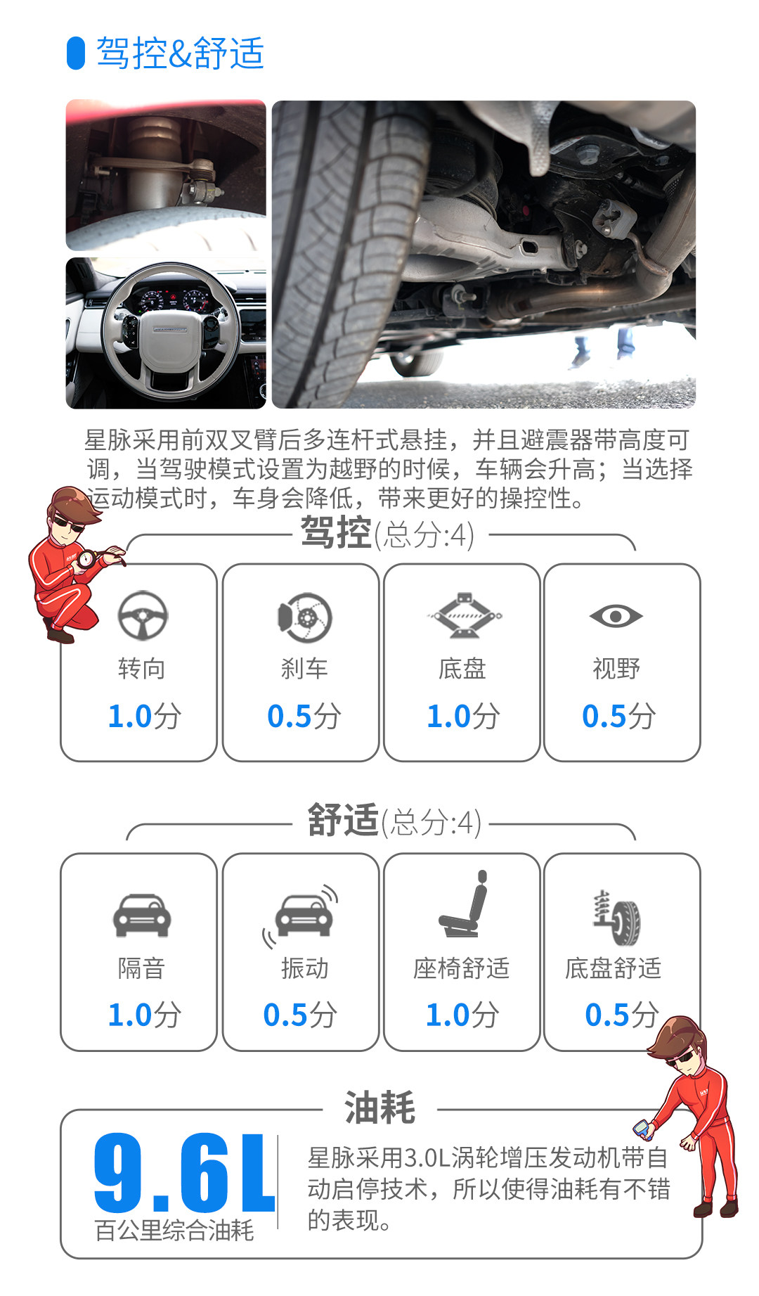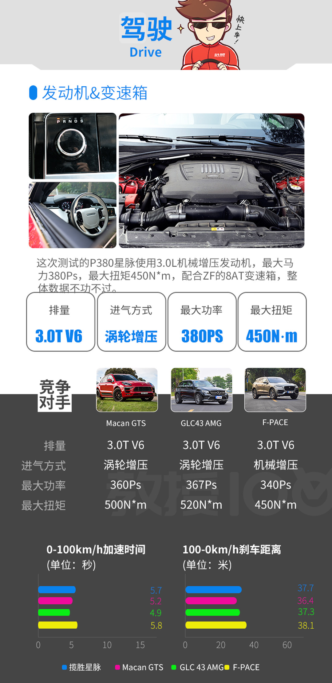 相比运动的外观,整体开起来,星脉的调校偏向舒适性,它的感觉更像揽胜,给你一种安静舒适的感觉。慵懒的油门在加速初段似乎隐藏着它的实力,随着转速的提升,发动机似乎苏醒过来,到了中后段体现出3.0L机械增压发动机的实力,在100Km/h以上依然底气很足。