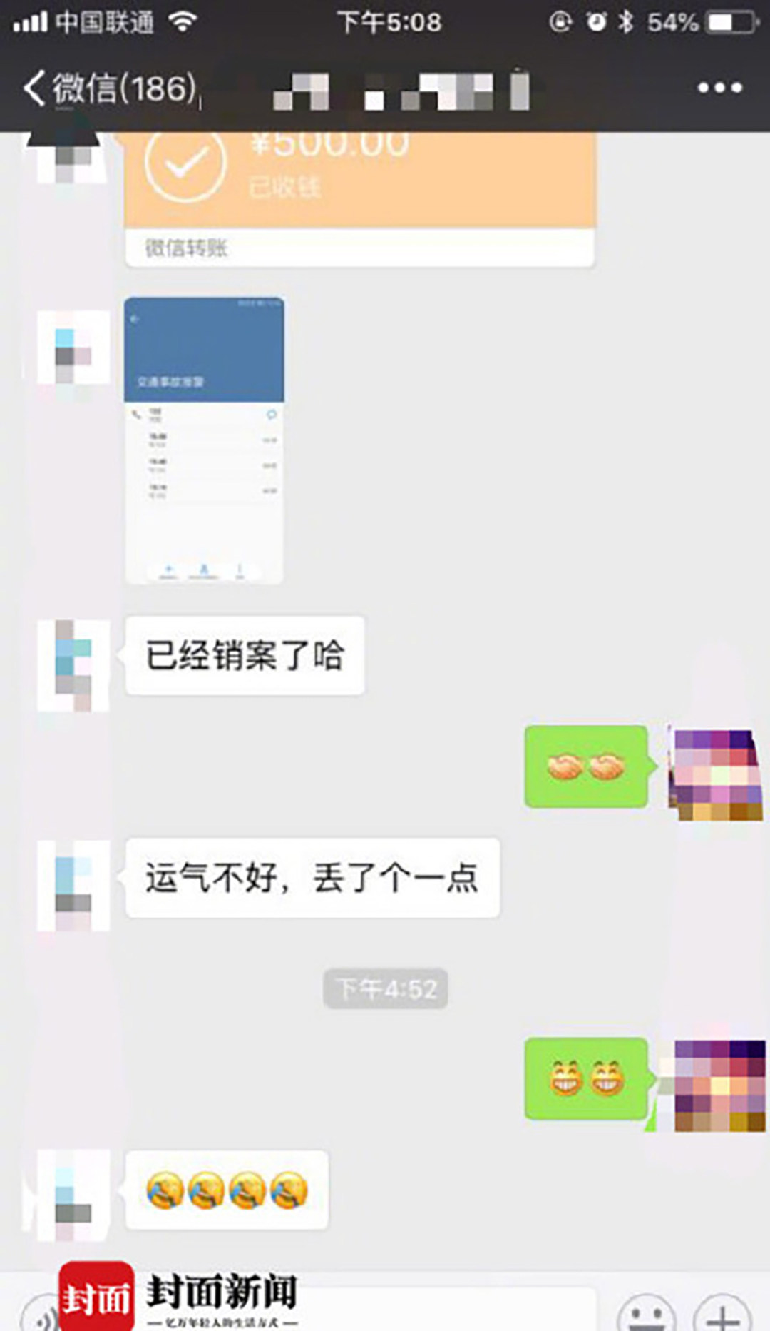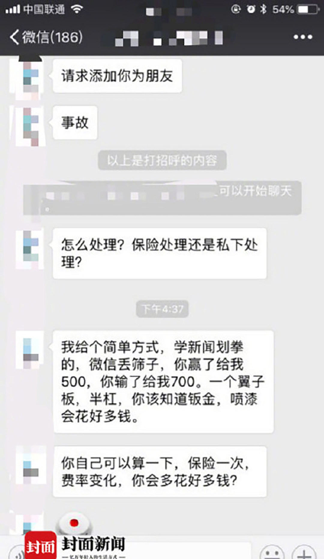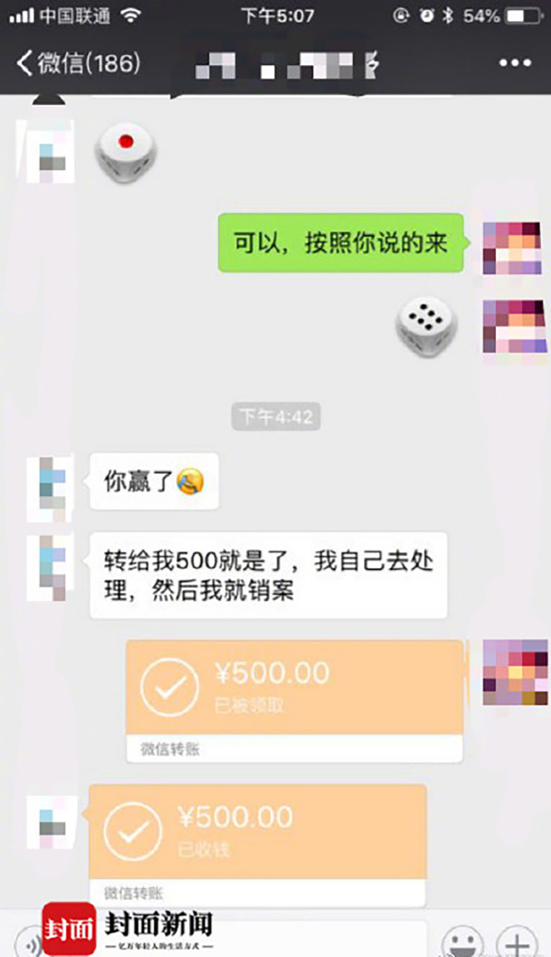 近日有媒体报道,成都的张先生与杨先生在路上发生刮碰,去快处中心路上,双方跟丢。随后,双方商定用微信丢骰子决定赔多少钱,最终,问题顺利解决。这样和谐地解决问题十分值得称赞。(图片源:封面新闻)