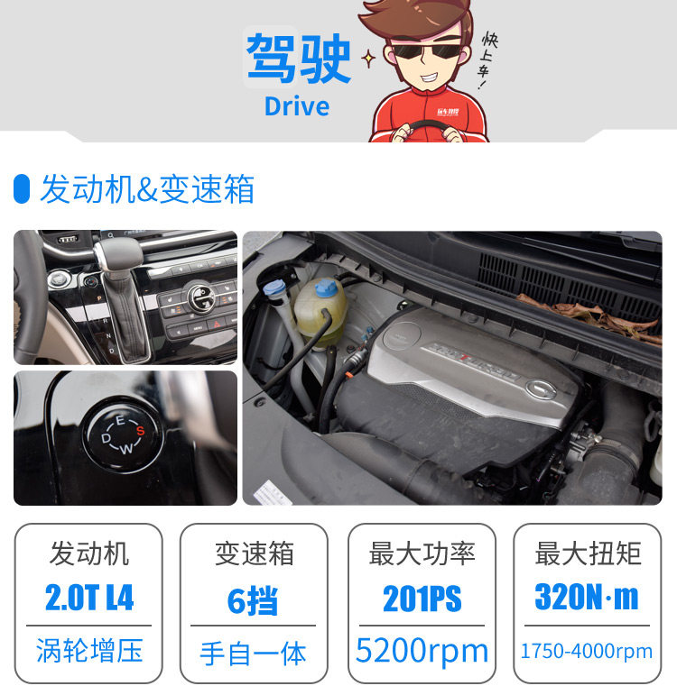 GM8采用了传祺目前最高端的2.0T+爱信6AT的动力组合。传祺这副2.0T采用了多点歧管电喷技术和DCVVT双侧连续可变气门正时技术。虽然发动机的技术并不是最先进的,不过广汽将这台发动机的研发重点放在耐久性,例如使用正时链条、铸铁缸体、液压摇臂。爱信6AT也是以耐用著称的产品。