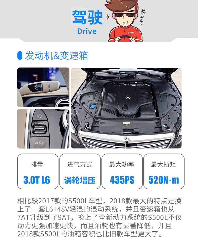 2018款奔驰S500L采用了一套3.0T L6+48V轻混+9AT的动力系统,综合动力表现相比2017款S500L车型有些许提升。油耗有显著降低,虽然这套动力系统是搭载在S级这样的豪华车型上,然而S级加速时的爆发力还是十分恐怖的,实测5.3秒的加速水平也很强悍了。