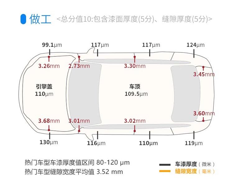 整个厚度值平均下来大约在115.16μm左右,对于一般热门车型领域来说,厚度偏大。而间隙度表现得较为不错,经过教授测量,其平均值约为3.25mm左右,与热门车型3.52的缝隙度平均值相比,工艺水平较为不错。