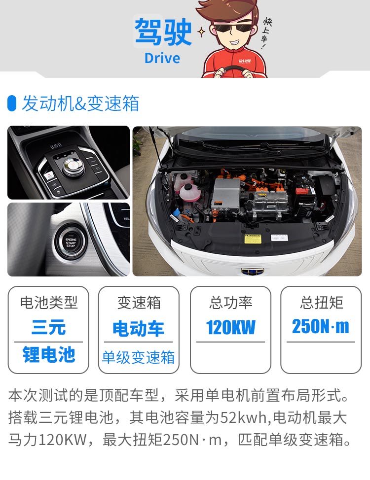 与帝豪GS的主要区别,大概就是动力体验的不同。在不同的动力模式之下,刹车灵敏度会有些小变化,但加速变化不大。动力调校的温顺,因此,续航里程也不会很快的被消耗掉。另外,当动力回收调节到最强档位上,在起步加速的时候,会感受到些拖拽感。整体的悬架调节属于比较扎实,但转向也较为轻松,驾驭该车辆是一件轻松的事。
