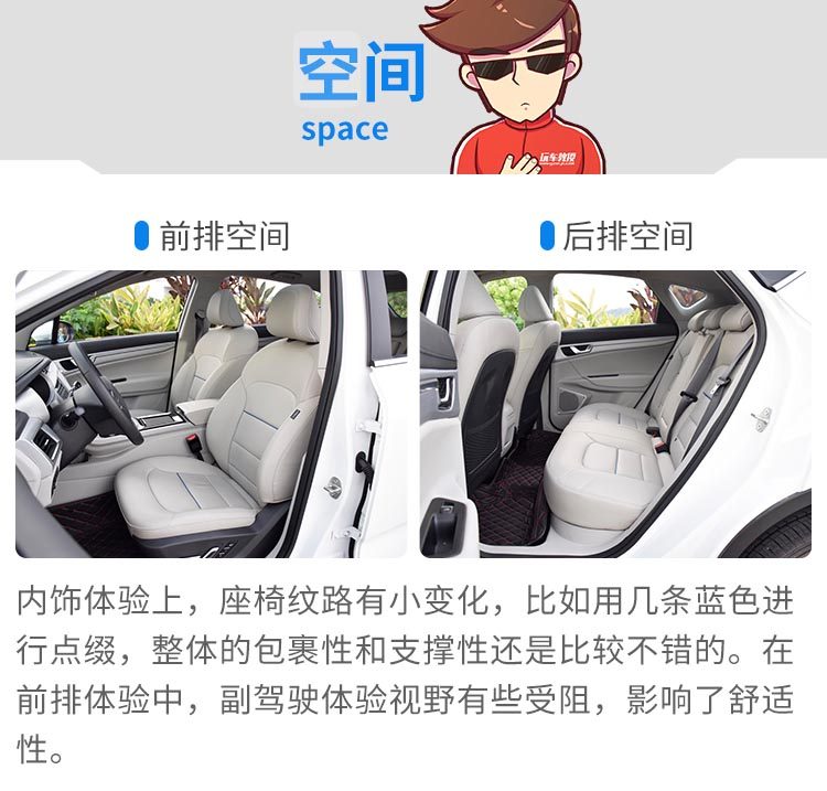 前部空间,以教授171cm的身高为例,调节合适的座位,前排头部尚有一圈空间,前排腿部空间较为充足。而来到后排空间,在前排座椅调节合适位置的前提下,头部空间稍微有点紧凑,其头部空间剩下四指;而腿部空间尚有两圈三指,腿部空间富裕。