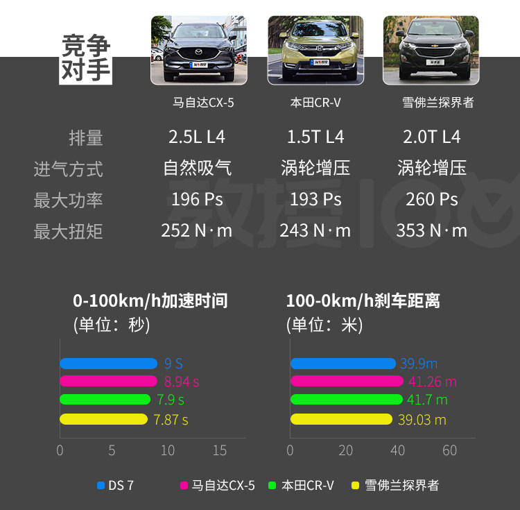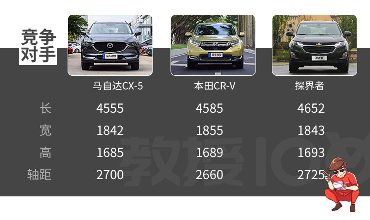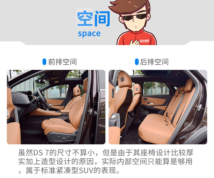 虽然定位紧凑型SUV,但是DS 7的尺寸比起CX-5和CR-V等标准紧凑型SUV都要更加大,而且轴距也十分有优势,反倒和中型SUV雪佛兰探界者比较接近了。
