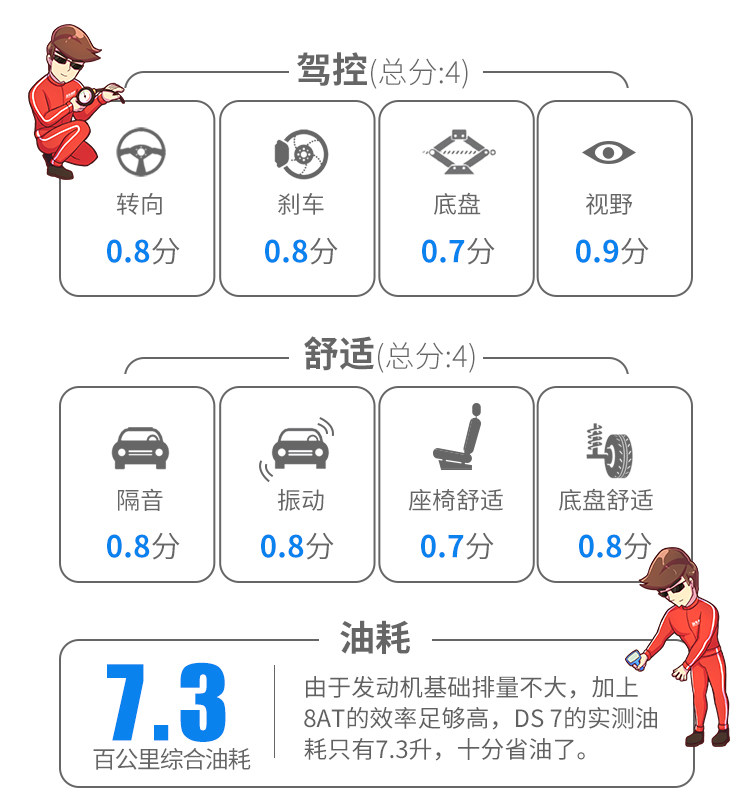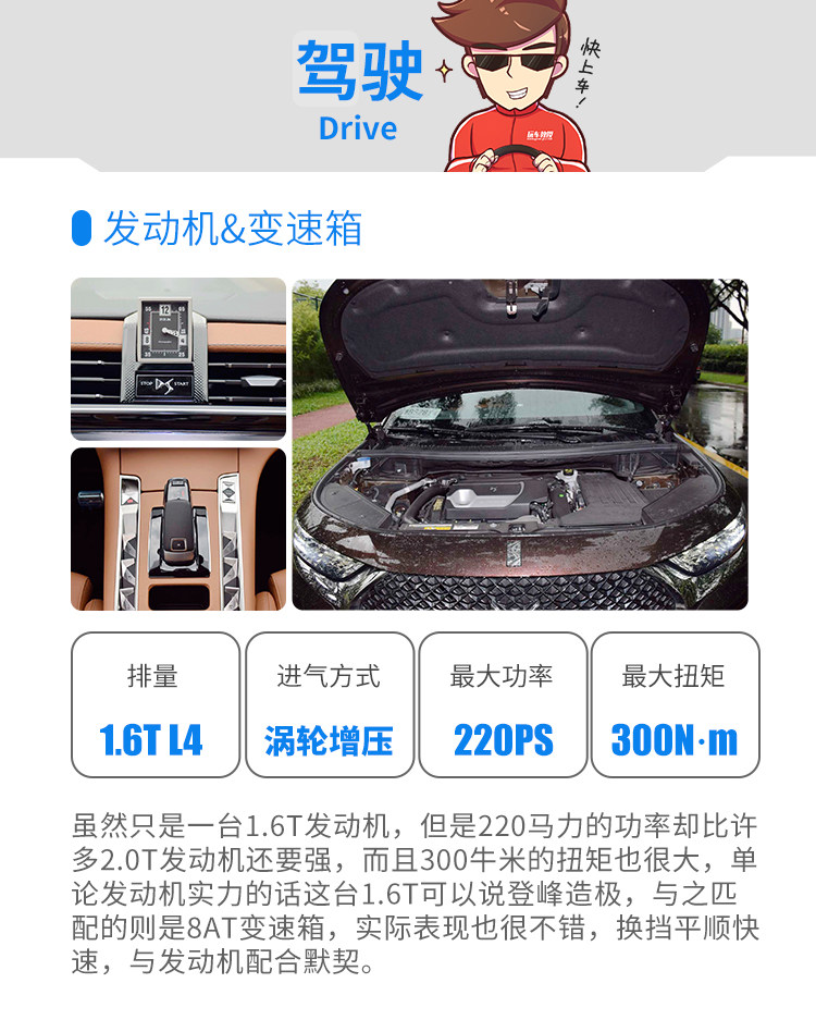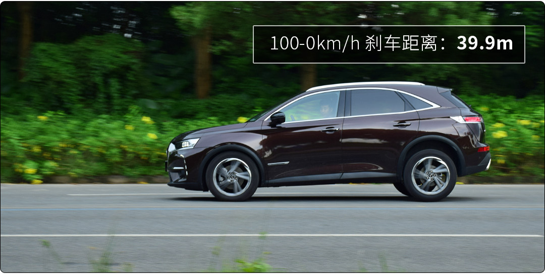 严格来说DS 7的加速成绩不算快,不过这个起步的姿态可真是够唬人的,起步瞬间抬起的车头很有气势,坐在车内主观加速感受也还是不错的。即便是这种高负载工况,变速箱也没有丝毫顿挫,表现很值得表扬。