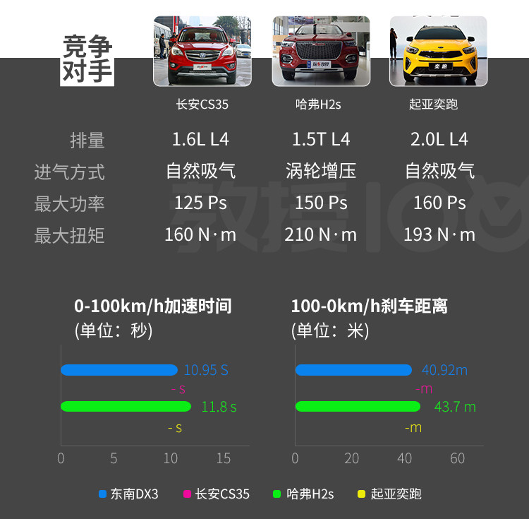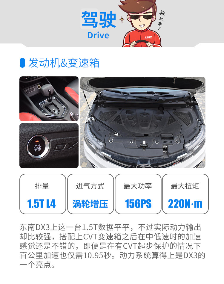 虽然DX3的自重比较重,且CVT有起步保护功能,不过得益于强劲的动力,最终DX3的破百时间为10.92秒,实际加速感觉也比较强,可见DX3这套动力系统还是有一定运动感的。