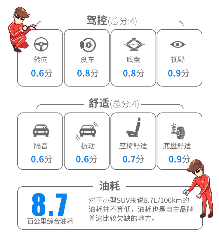 在自主SUV中40.92米的刹车成绩也算是不错了,DX3刹车时整车的姿态不算太好,车头的下沉比较严重,不过好在刹车踏板的脚感不错,ABS的弹脚现象也比较轻微,方向也没有跑偏情况,整体还是值得打一个高分的。