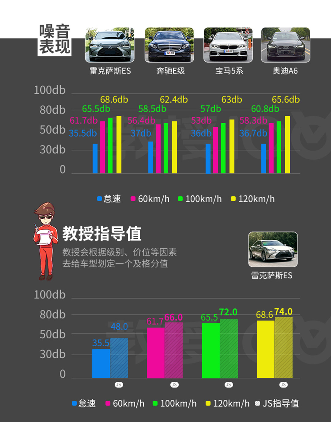 而我们实测ES300h的车厢静谧程度让人眼前一亮,怠速时ES300h车内分贝值仅为35.5db,同级最低,而120km/h下,ES300h的车内分贝值也未超过70db的水平,为68.6db(低于S500L)。