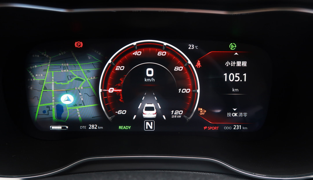 实际情况如何?早上拿到试驾车时其续航里程数为420km,全程开着空调,常规使用NORMAL模式,遇到路况好或者山路则使用SPORT模式,基本按照燃油车的驾驶习惯,地板油也没少给,外加近一个小时通着电开着空调的静态拍摄,最后总共行驶了105公里,剩余里程数还有282km。也就是说消耗了138km的续航里程,总体表现其实超乎教授的预料,如果一直使用ECO模式开个400公里也是有可能的。