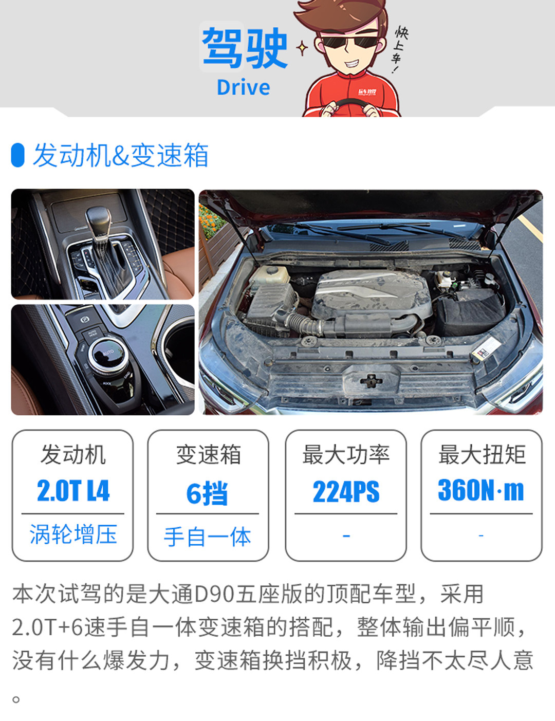 本次试驾的大通D90是五座版的顶配,所以各种功能一应俱全,不过由于没有接入网络,所以很多功能都不能得到完全的使用。除此以外,用料、做工都没问题,符合这个价位车辆的标准,三区自动空调以及座椅通风好评,在炎热的夏天一个座椅通风简直就是天堂。