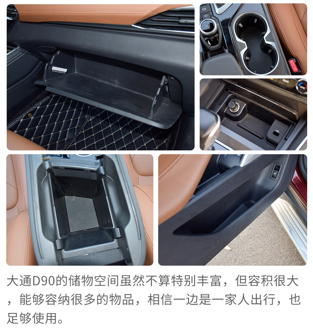 大通D90的储物空间很丰富,由于没有第三排座椅,所以后备箱空间十分足够,但不足的地方在于由于其车身很高,导致后备箱开口过高,对于身材不是很高大的同学不友好;此外车内的储物不算特备丰富,但容积很大。