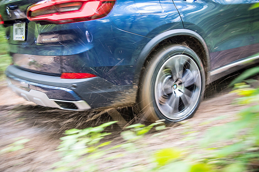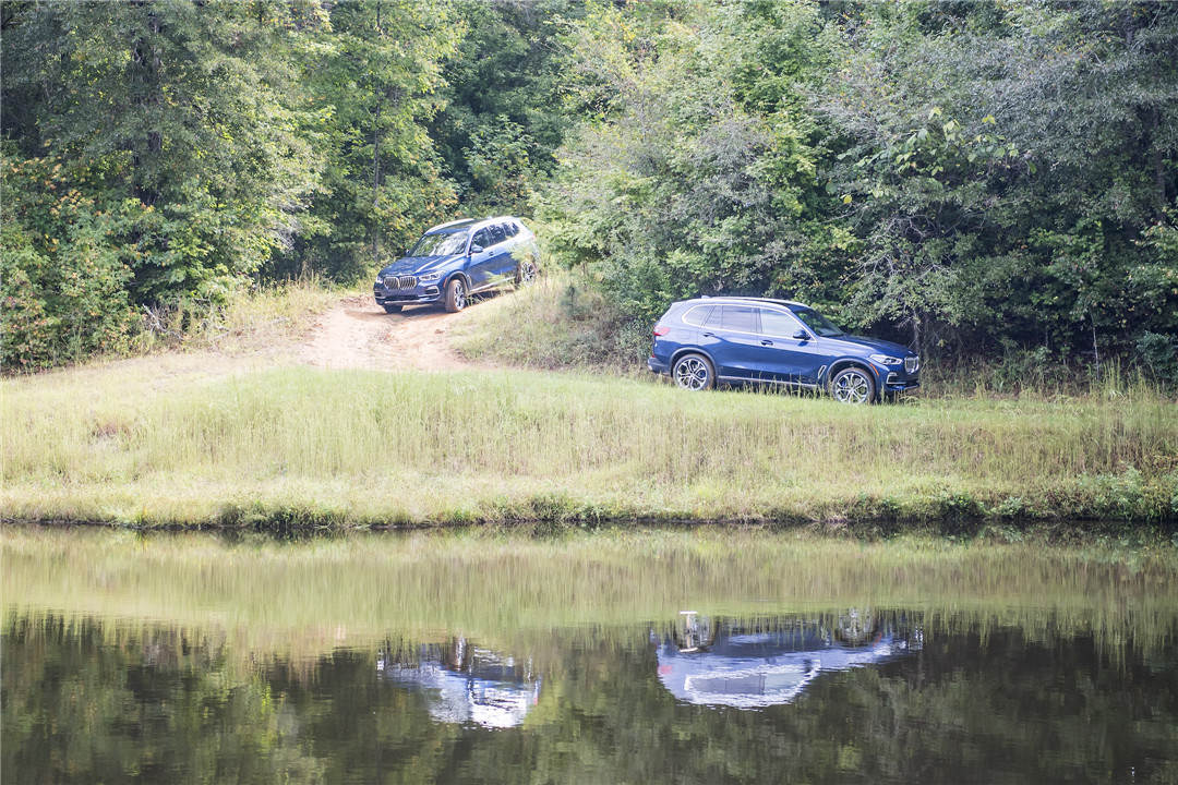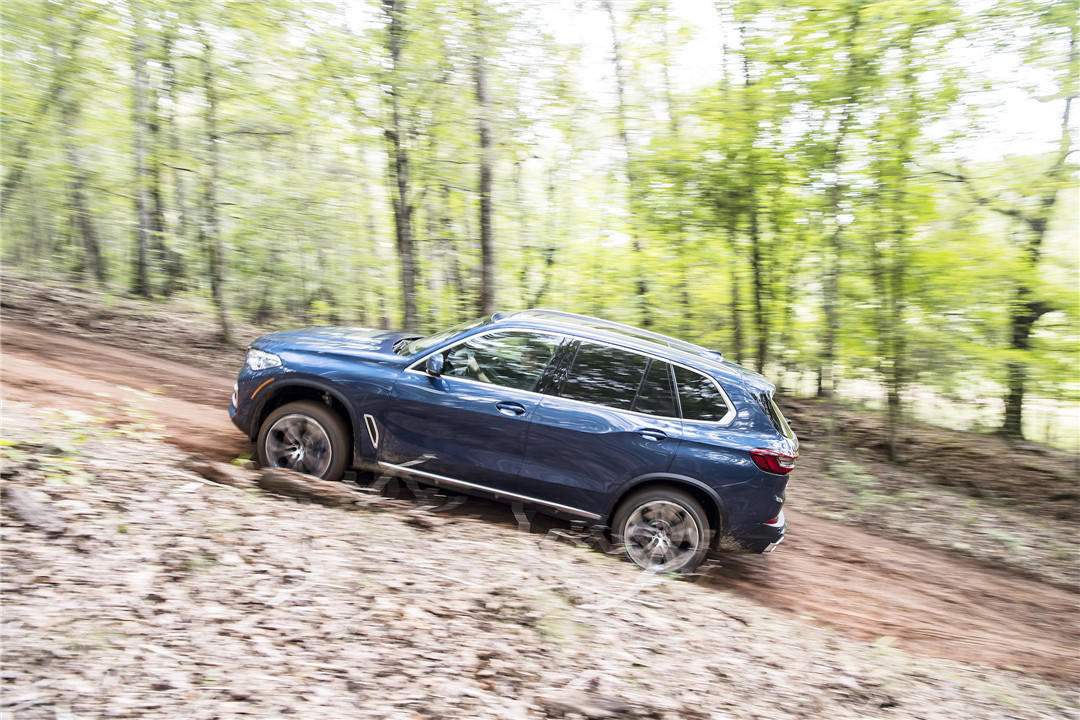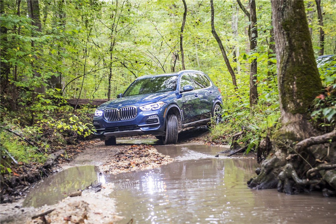 在随后的越野体验中X5的表现也确实让人满意,在我们开着X5跑进树林玩耍时,本以为配备PZERO夏季胎的X5会因为抓地力问题会出现些尴尬的状况,但是凭借车辆线性的动力输出,前后轴之间合理的动力分配以及车轮打滑时强大的电子限滑能力,加上较高的离地间隙和越野套件加持,X5在丛林里不仅没有出现陷车的尴尬情况,而且还玩得挺欢,在过水潭时X5的表现也足够淡定,甚至面对将近40度的陡坡时X5也能顺利爬上爬下,这样的越野表现虽然不像路虎那么变态,但是也能够带你穿过林径跨过大山了。