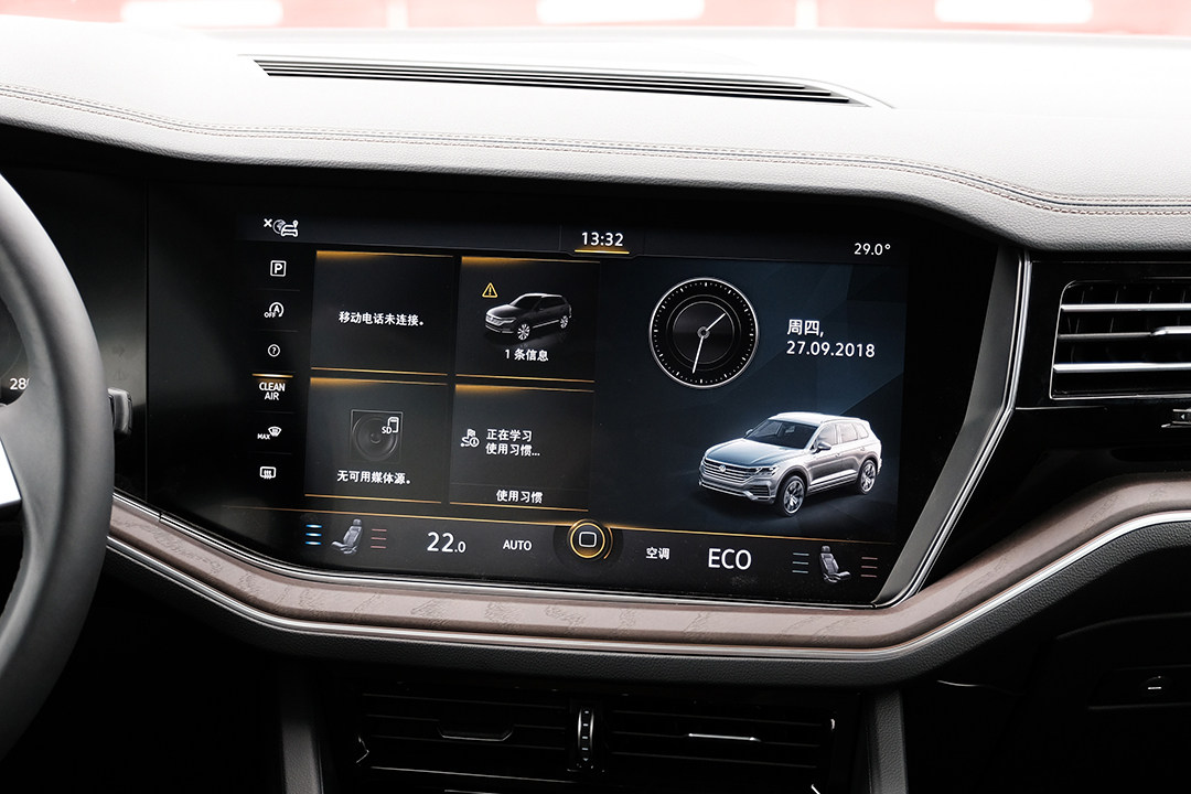 全新途锐的内饰设计线条棱角分明,搭配全液晶仪表盘和15.3寸触控屏,营造出强烈的科技氛围。