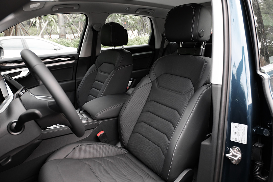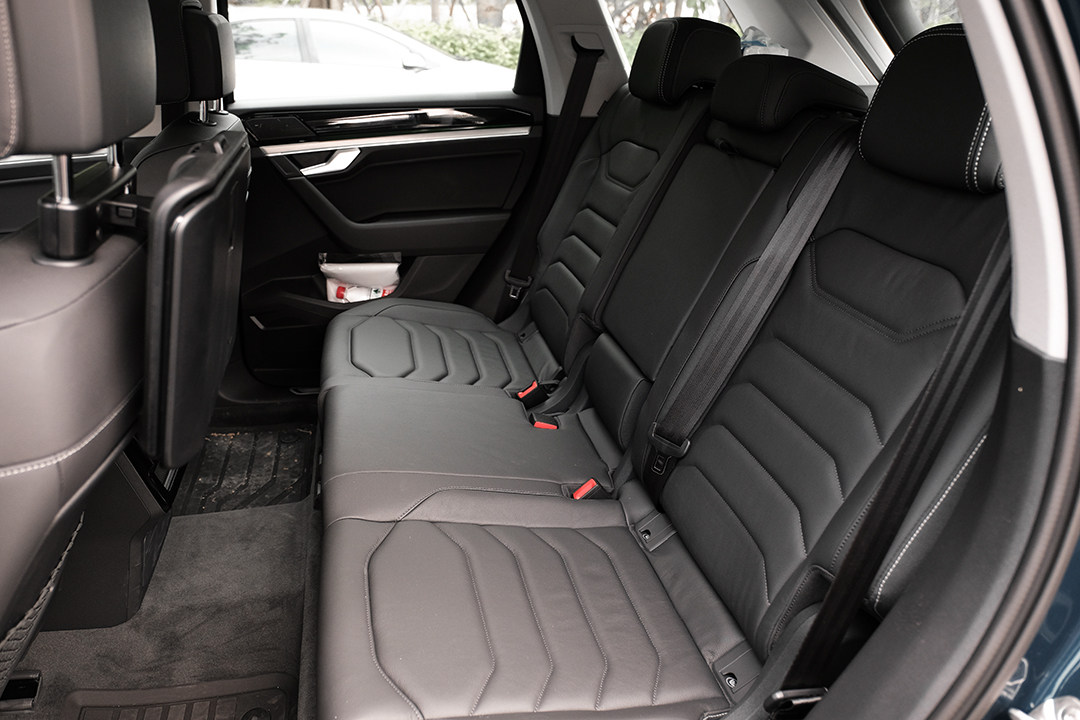 全新途锐的座椅造型虽然比较硬朗,但其填充物较柔软,腿部承托和腰部支撑也比较到位,因此实际乘坐舒适性还是比较出色的;而在后排空间方面,全新途锐的表现与上一代车型接近,身高1米7的体验者在调整驾驶座至合适坐姿后,后排乘客有大约两拳的腿部空间,加上腿部支撑表现不错的后排坐垫,其后排舒适性还是比较出色的。