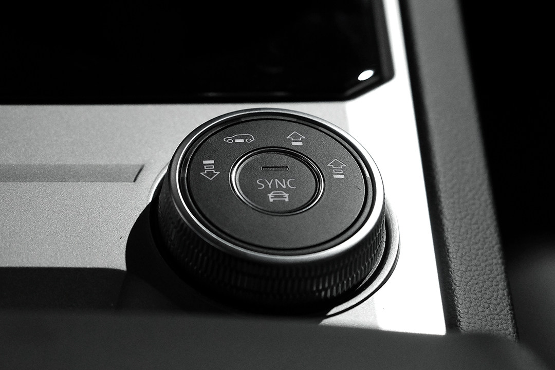 全新途锐全系标配自适应空气悬挂,可随车速变化自动调节悬挂高度,同时也可通过换挡杆右后方的旋钮进行手动调节。