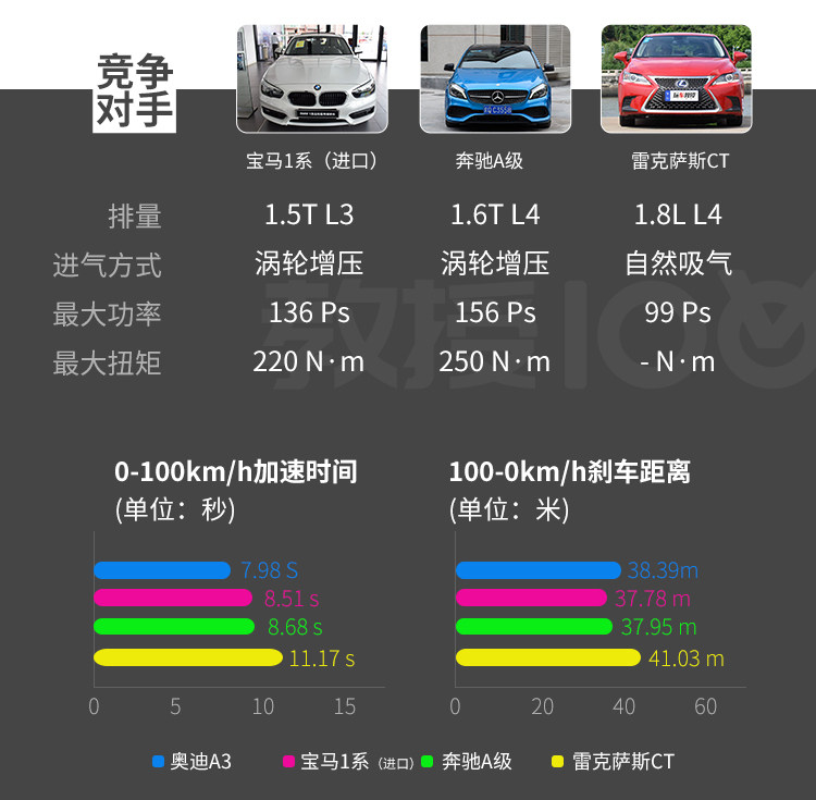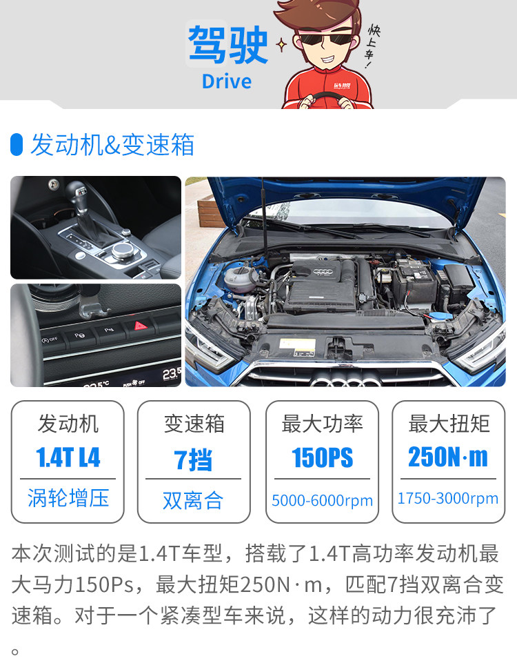 A3的起步加速相当伶俐,尽管起步时变速箱有一定保护,但是凭借强大的动力和出色的换挡速度,A3最终实现了7.98秒破百的成绩,相比较竞争对手来说快了不少,而且A3在中速段的加速感觉也相当爽快,看得出这套动力系统确实很强大高效。