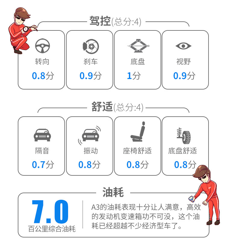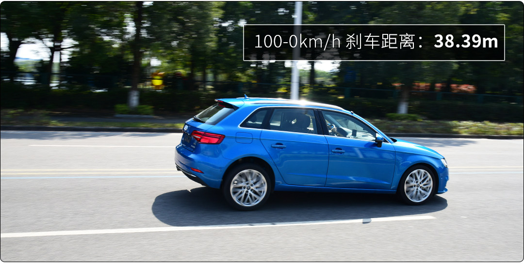 和加速一样,A3的刹车表现也十分出色,38.39秒的刹车成绩很优秀,而且刹车时的脚感也不错,刹车踏板比较线性,急刹时ABS的弹脚感也很轻微,多次测试的刹车成绩也比较稳定,值得表扬。