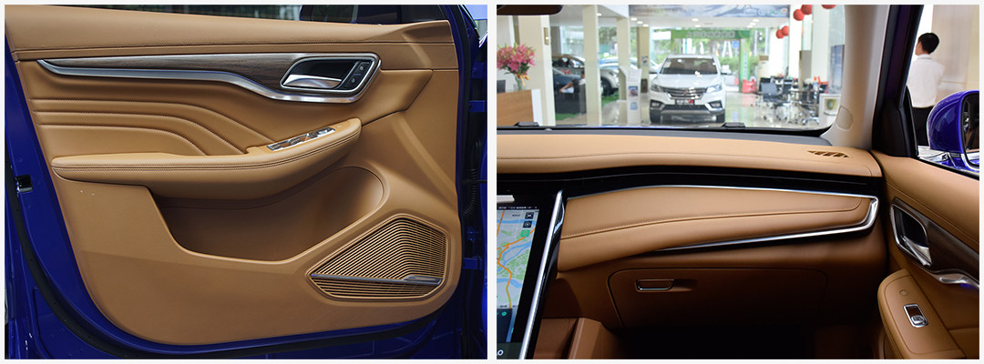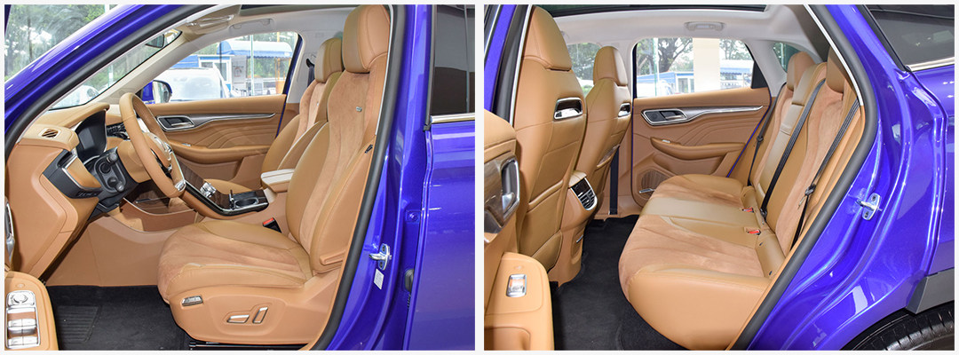 车内大面积地使用了皮质材料进行包裹,而且在工艺处理上也采用了打孔、缝线、以及更多的褶皱处理以达成拉高档次的目的。