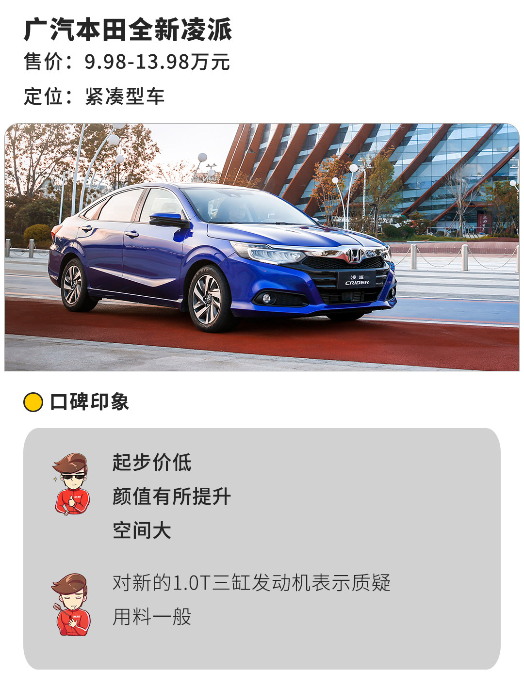 新一代凌派上市前,教授记得自己说过,如果它的价格定得好,未来的市场表现是很可观的。而9.98-13.98万元的价格令人惊喜,也令新凌派更有竞争力。5款配置中,教授最推荐的是2019款180Turbo CVT领先版,它也是次顶配车型;配备了多项主动安全配置,8英寸中控大屏、手机互联、LED日间行车灯等时下必备的元素也拥有;整体配置的实用性和丰富度都是比较适合的。