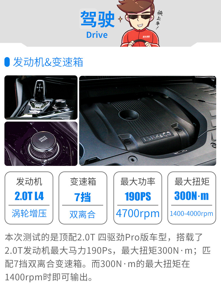 而在驾驶方面,领克02所展现出来的水准并不低,正常加速情况下,变速箱换挡爽快干脆,动力输出源源不断。基本在任何转速情况下踩下油门,动力的反馈感比较及时。此外,油门和刹车的脚感比例做得较好,这点比较讨人。