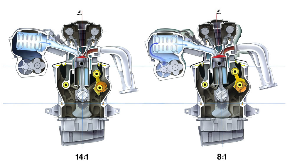 虽说米勒循环一定程度提升了发动机燃油经济性,但是它对发动机动力并没有多大改善。因为发动机结构还是没有变,这里教授讲一个现象,平常慢慢悠悠开车时,发动机负载很小温度低,但是上了高速开始释放天性时,发动机负载变大温度变高。发动机工程师就一直想压榨发动机低负荷工况时的性能,办法也很简单提高压缩比。传统发动机活塞、连杆以及汽缸盖都是固定的,所以发动机压缩比设定好就不能改变。一旦把压缩比提高压榨动力,那么高温高负荷下就会发生爆震,以至于发动机极限性能不佳,把压缩比调低一点,虽然发动机极限性能更好,但是低负荷工况效率不高。所以工程师不得不退而求其次,设定一个不高不低的压缩比。