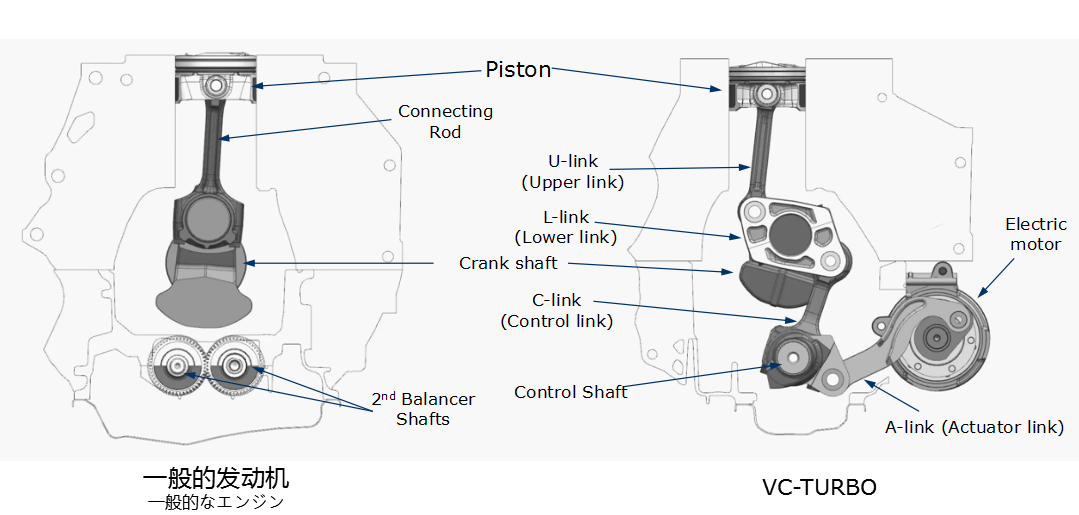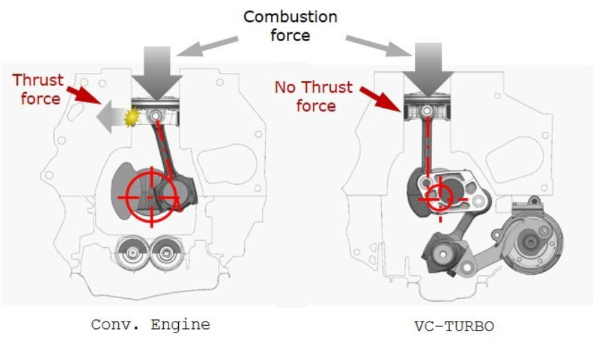 得益于多连杆机构的加入,活塞连杆摆动幅度更小,而且活塞运动速度速度更接近正玄曲线,VC-Turbo不会发生2次惯性力,所以发动机也就不需要平衡轴,日产的VC-Turbo运转平顺性远远好于传统4缸引擎。