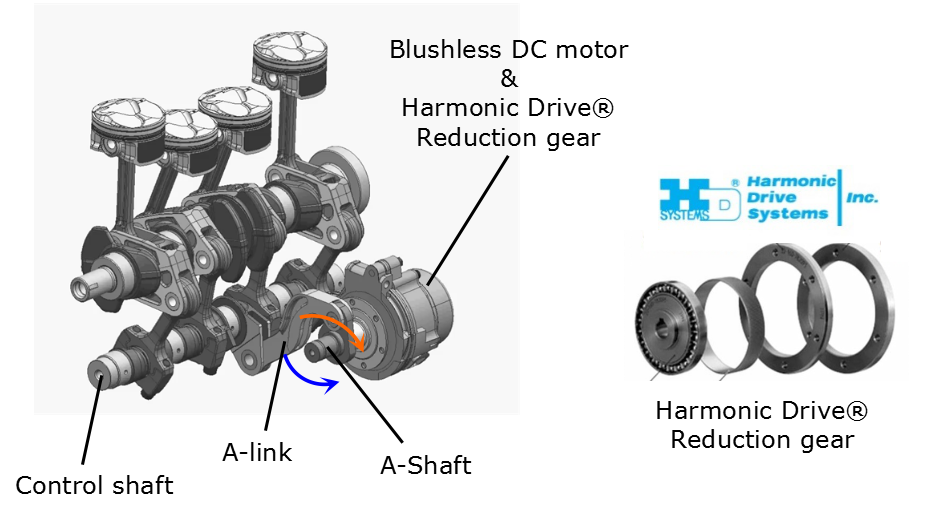 可变压缩比发动机结构看上去简单,但是要把它做到小型轻量化,并且满足量产要求可不容易,比如为了让电控机构做到非常紧凑,日产就专门使用了谐波传动减速器,以实现电机小型化。