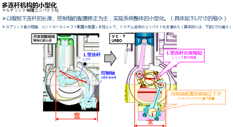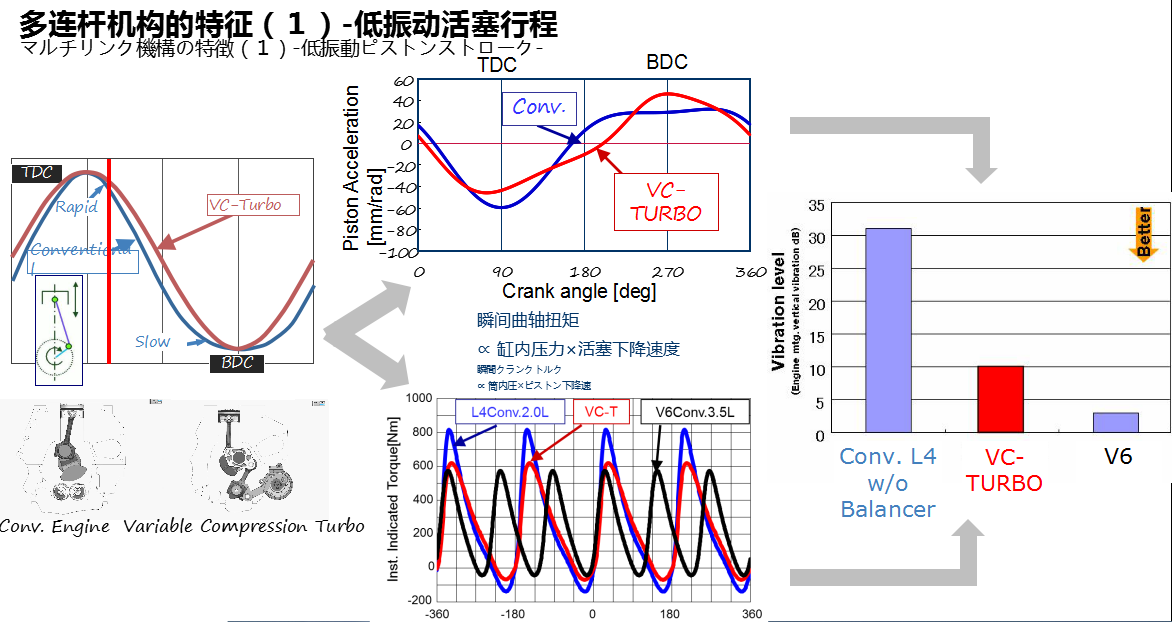 在发动机设计中,一般希望把活塞与曲轴中心点分开布置减少活塞侧压力,但是曲轴偏置又不能太大,日产这套多连杆刚好解决了这个问题,可以说这项设计是一箭三雕!