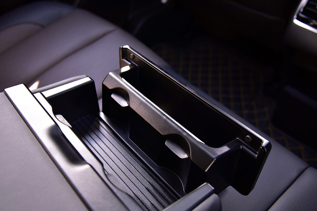 后排中央扶手的水杯架,设计的宽度较大些。放置一些普通尺寸的矿泉水,由于卡钳度不够,水瓶在车辆转弯、较差路面、较激烈驾驶的话,会有来回左右晃动的情况。