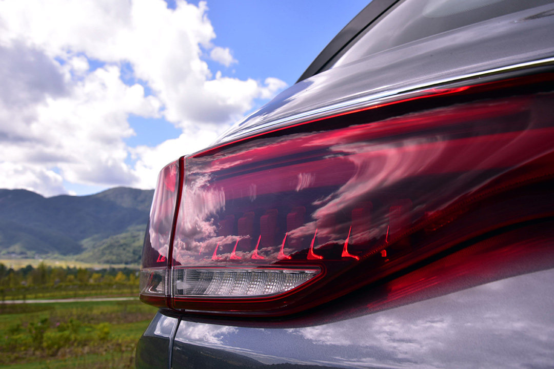尾部有几个地方可以提升整个视觉精致感,首先左右车灯接连,形成连贯式的尾灯、夜晚点亮非常有辨认度。尾灯的样式也非常有意境,类似钢琴式按键,布落有致,据说是投入了190颗LED光源。最后,便是尾部底下的镀铬装饰了,前后遥相呼应。