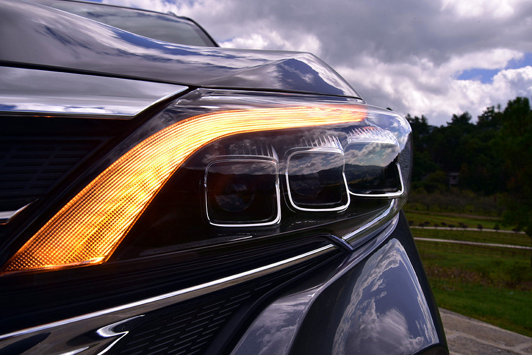 前脸的横向舒展度非常好,这得得益于几个地方。首先,大灯的设计样式上。3颗矩阵式LED,并且带透镜,自然而然的得到了视觉扩宽的效果。其次,便是进气格栅的运用,一分为二,上方很好的与矩阵式LED大灯相连,下方依次递进,再辅以金属镀铬装饰及车身线条塑造。