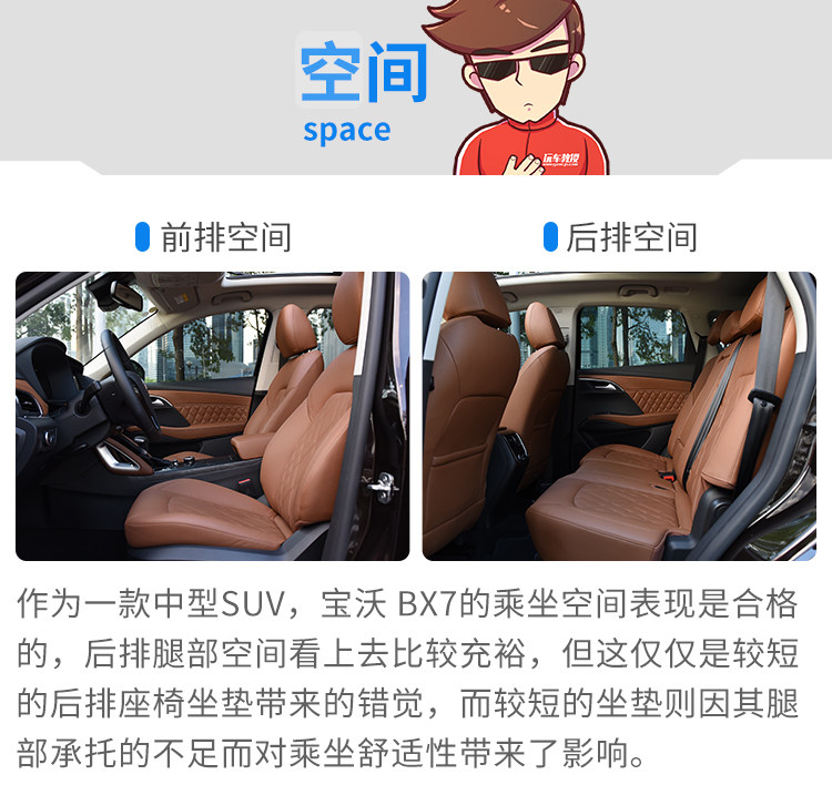 虽然宝沃是一个中国企业扶持下重新建立的品牌,但其设计研发还是由位于德国总部的团队完成,因此BX7在底盘调校方面依然具有典型的德系车风格,对路面细微震动的过滤并不彻底,保留了部分路感,而对明显的路面起伏和坑洼的处理则比较出色;与此同时,BX7的电子助力转向系统也是采用偏向舒适性的调教,方向回馈力度偏轻,路感比较模糊。