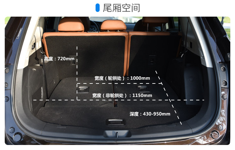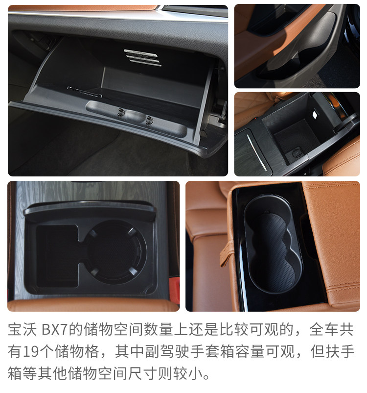 在第三排座椅放倒后,宝沃 BX7的尾箱储物空间还是相当可观的,尤其是尾箱两侧和底部都做得比较平整,使用起来比较方便,但车厢内的储物格则大多尺寸较小,数量虽多但实际储物能力并不出色。