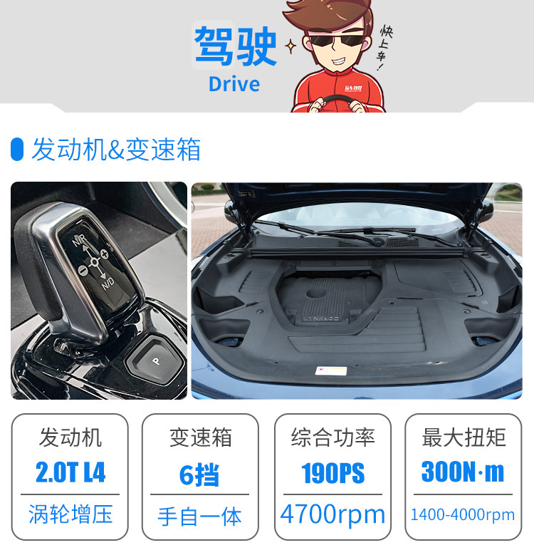 发动机其实就是是沃尔沃的T4,相信大家都比较熟悉了,标配2.0T+6AT,动力总成相当成熟而且可靠,起步价才15万,值得点赞!