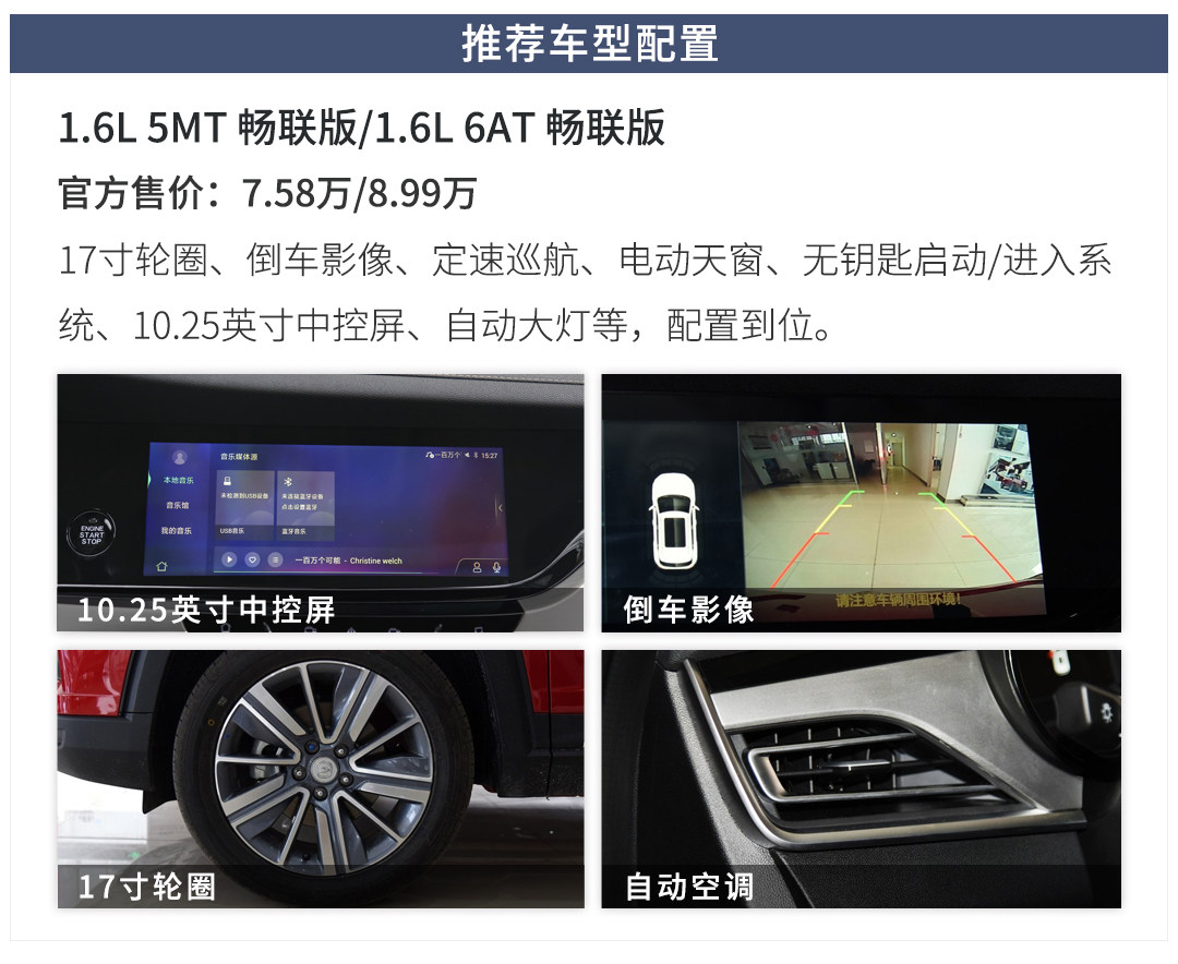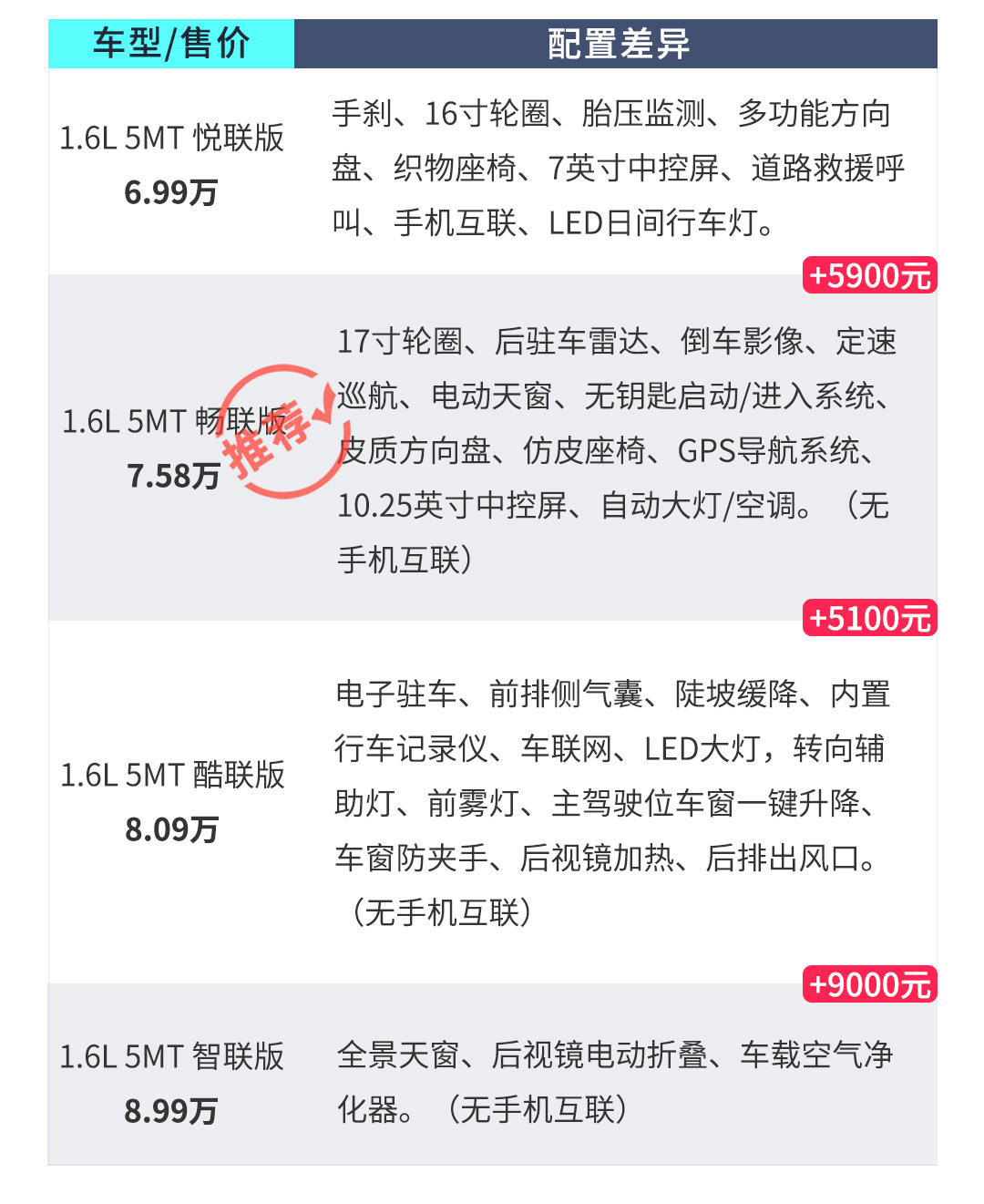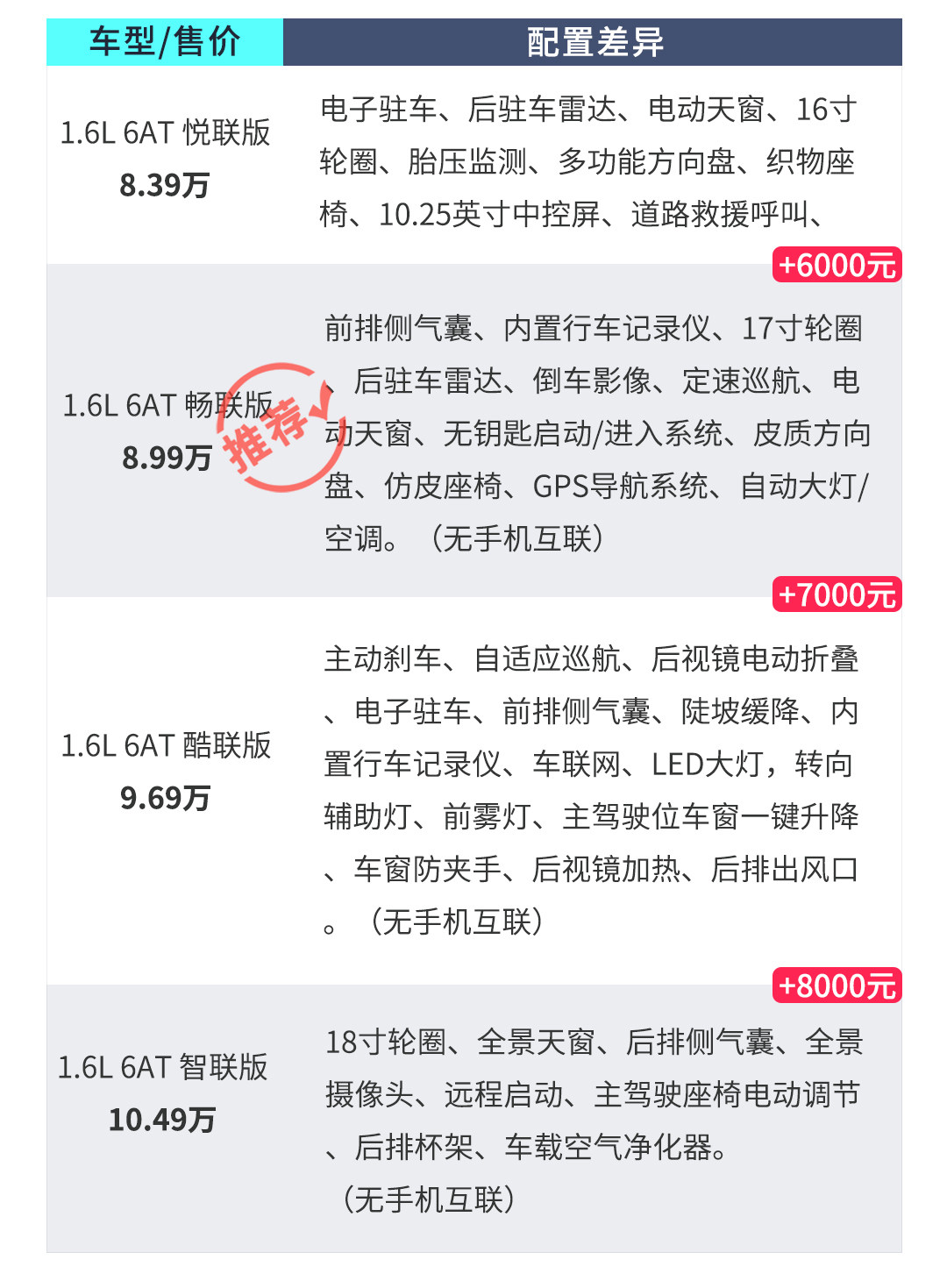 再来是自动挡车型,其实和手动挡车型对应的配置基本是一致的,只是有一两个配置不同。自动挡车型的最低配其实价格看上去还是比较吸引的,而且配置也相对到位,其实真的要买也没啥毛病,只不过我个人还是认为有天窗,有倒车影像,有自动大灯的车型配置会更受欢迎,而且加6000块也真的不算贵,所以还是和手动挡一样推荐畅联版。