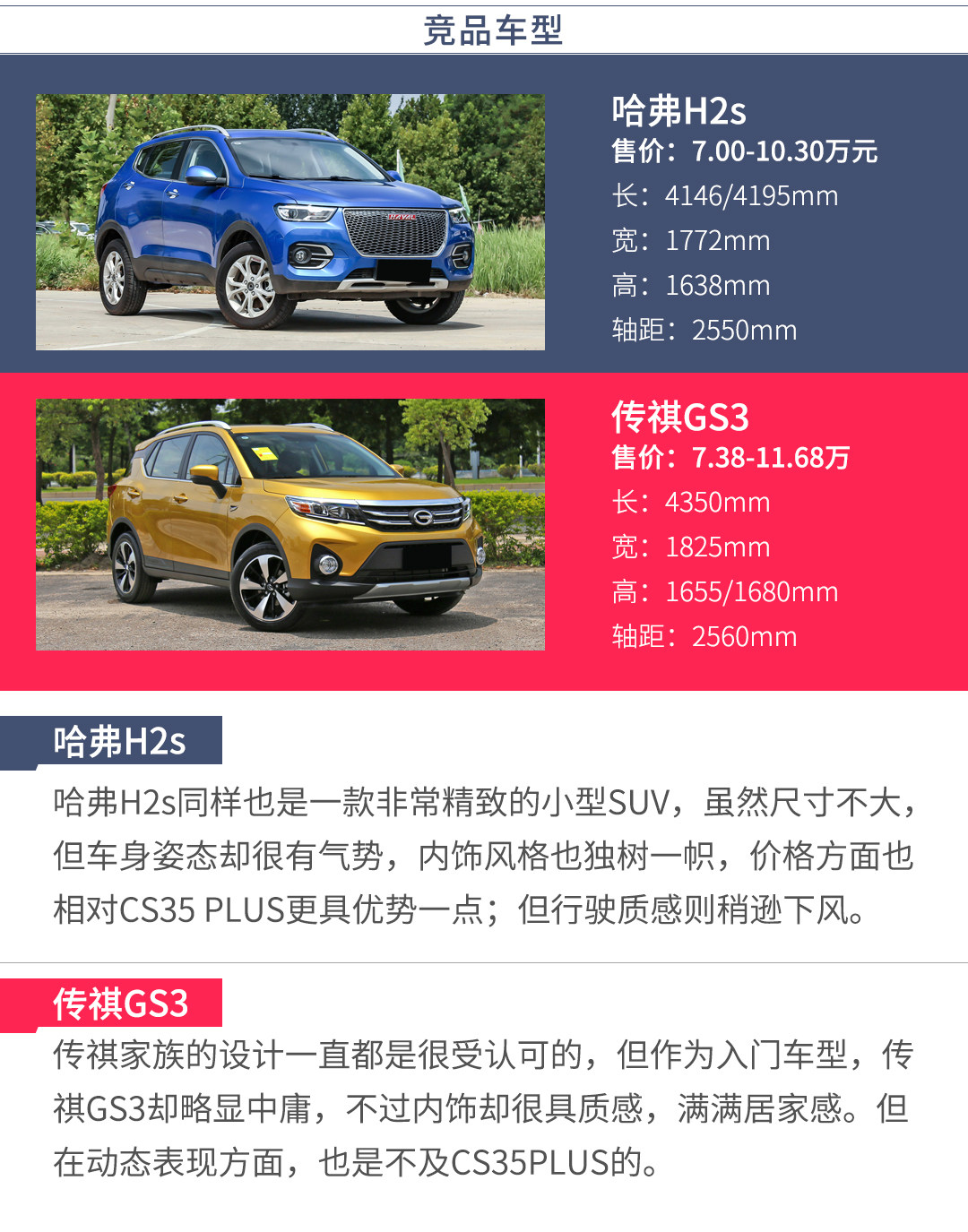 长安CS35PLUS的价格区间可以说是和哈弗H2s完全重叠的,两车的调性也几乎一样,而且各方面表现都有是平分秋色(动态方面CS35PLUS优势更大)。而至于传祺GS3的定价是更贵一点点,但相对来说,综合表现应该都不是长安CS35PLUS和哈弗H2s的对手。