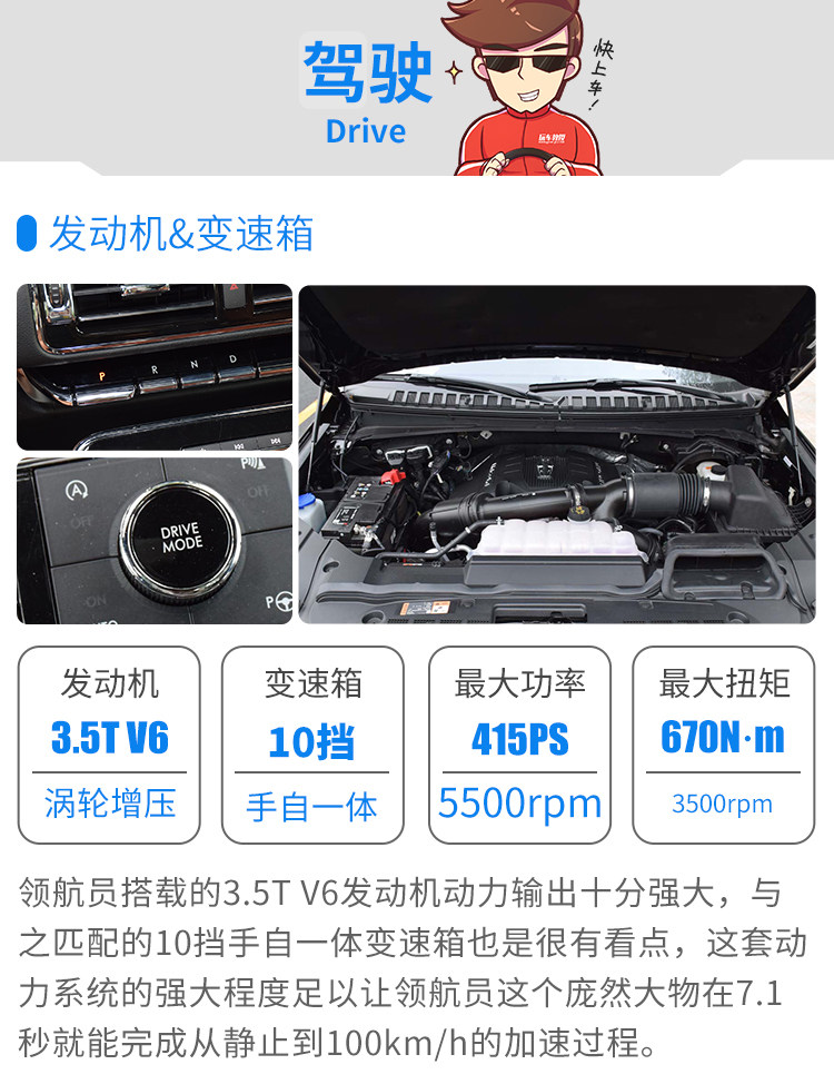 虽然重量达到了2825kg,不过在强大的3.5T V6发动机加持下,领航员跑出了7.1秒的百公里加速时间,实际加速过程中10AT变速箱换挡迅速,发动机动力也很强劲,整个加速过程持续有力,而且由于坐姿很高,加速感也比较明显,领航员的动力性能还真是不错的。